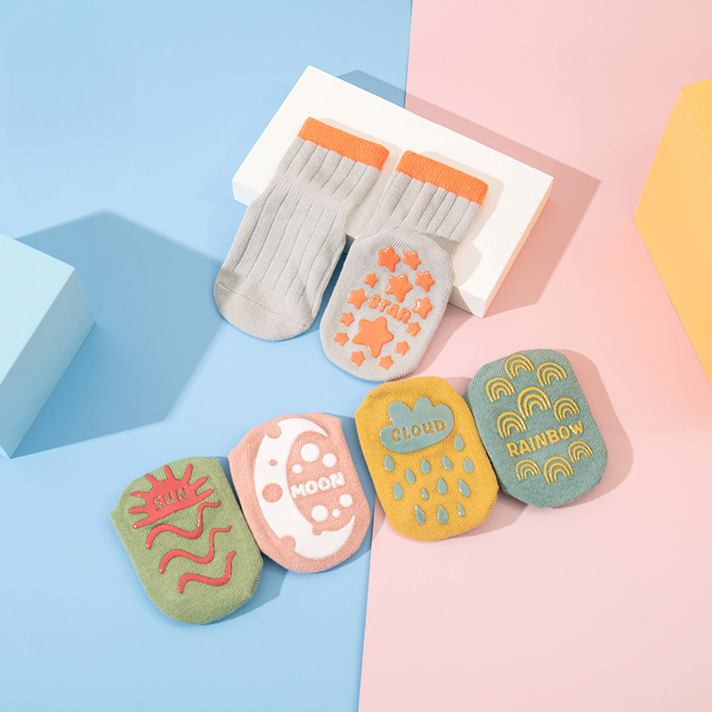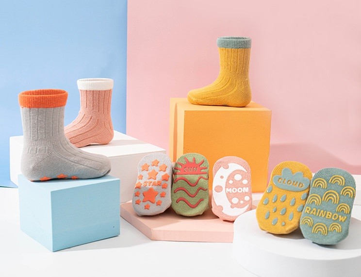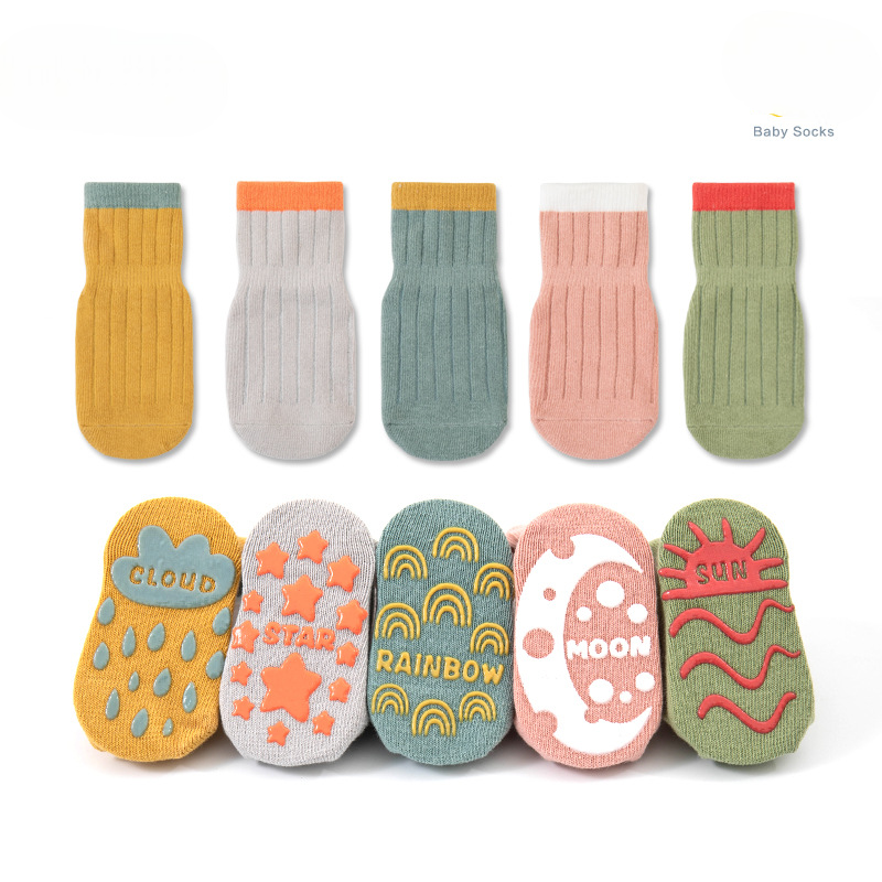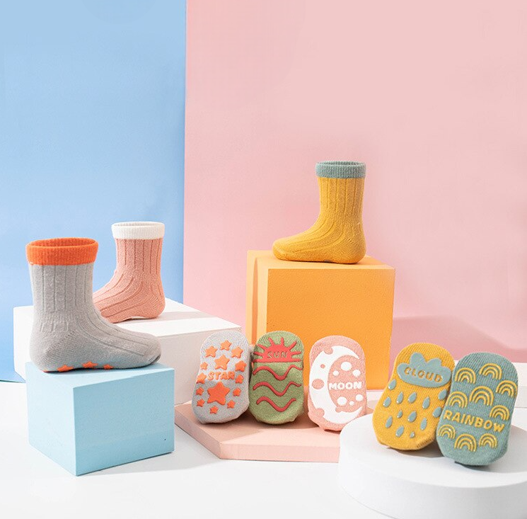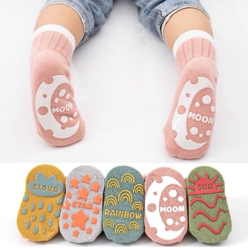Anti Slip socks for Kids !! it will help to kid walk in slippery surface and protect them form cold and germ !! All comes in 5 pair set and different designs